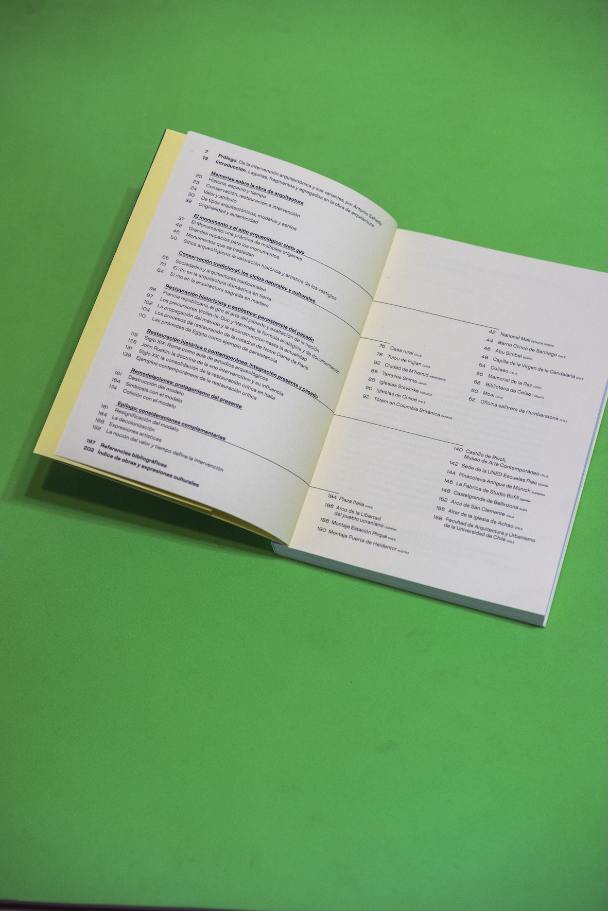 Con una particular aproximación casuística, esta publicación se apoya en ejemplos nacionales e internacionales para fundamentar su relato; desde sitios precolombinos en América, hasta las pirámides de Egipto y el Coliseo romano, como también intervenciones recientes como la catedral de Notre Dame de París en Francia, el edificio Portuario de Zaha Hadid en Bélgica o los Tulou de Fujian en China. Este libro invita a quienes estén interesados en la cultura y la arquitectura a explorar cinco tendencias clave dentro del campo del patrimonio arquitectónico: el statu quo, la restauración historicista, la restauración contemporánea, la conservación tradicional y las remodelaciones. A través de esta obra, se busca enriquecer el conocimiento en esta área y fomentar la reflexión sobre las intervenciones en obras de valor patrimonia